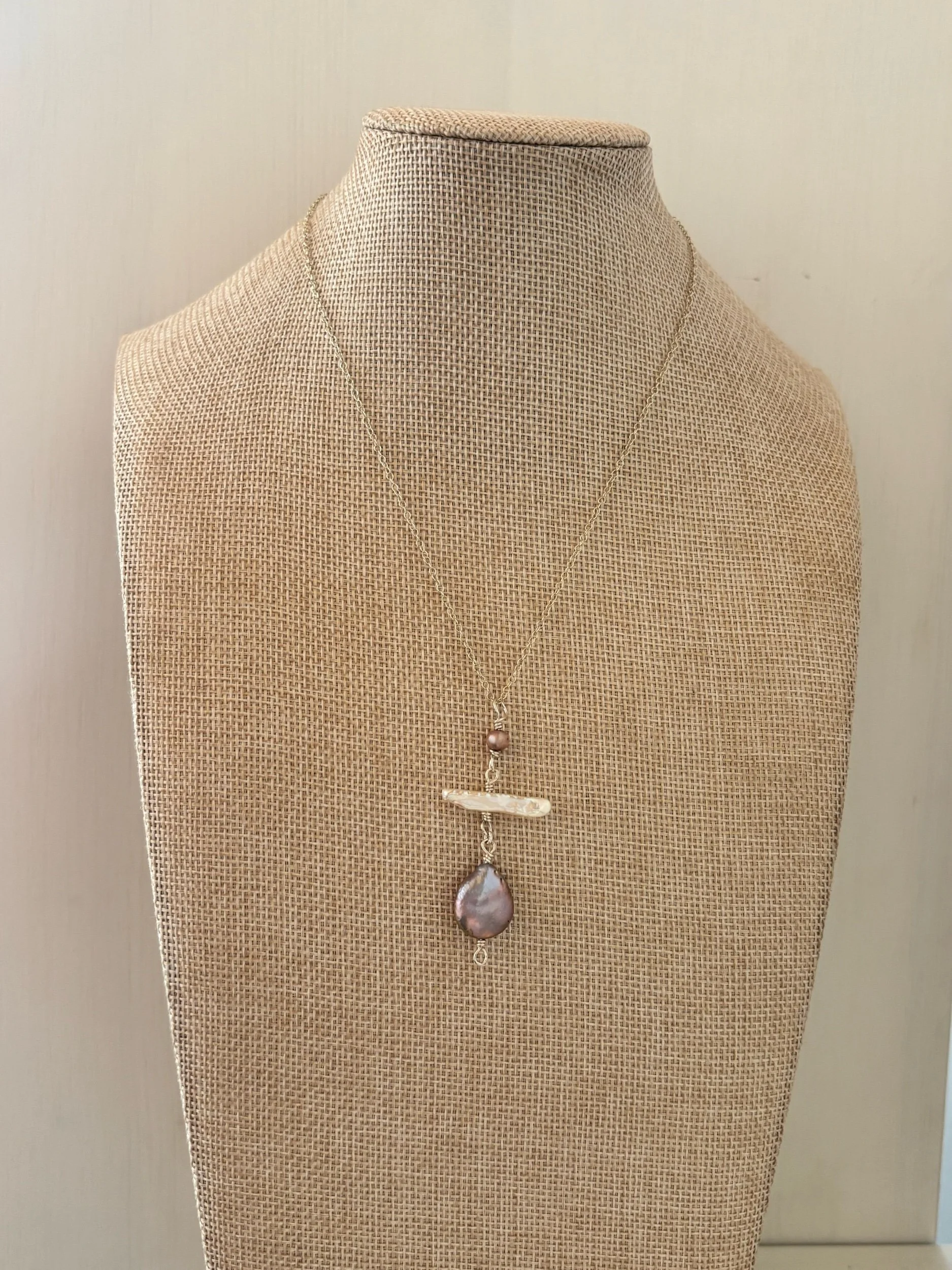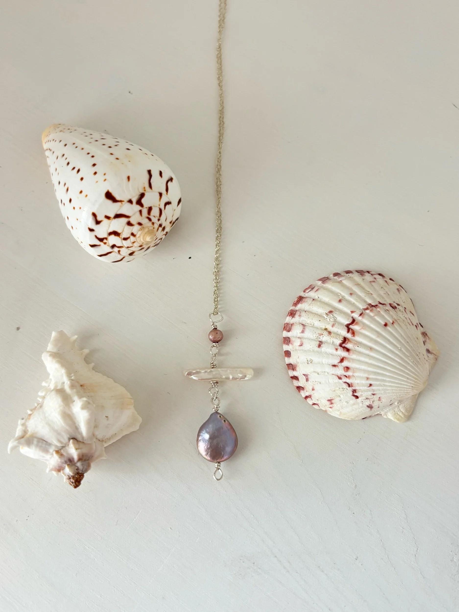 3 organically shaped freshwater pearls in hues of lush lavender, pale pink & water white on a 26 inch chain. Gold filled or sterling silver options available