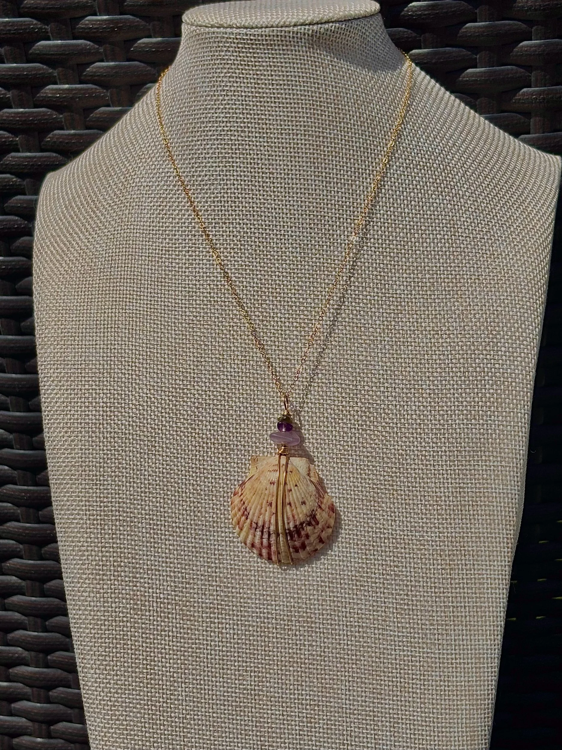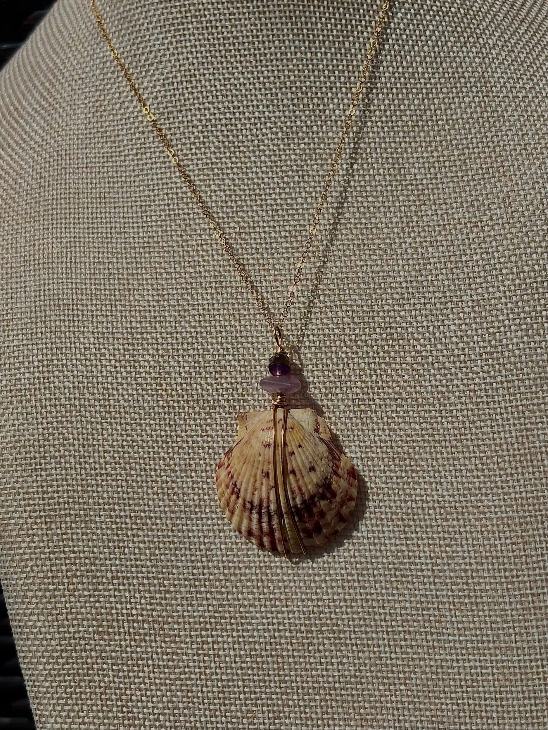 One-of-a kind Wire Wrapped Gold Filled Sunrise Shell Necklace with Authentic Gem Stones. 16 inch chain. Handmade in San Diego
